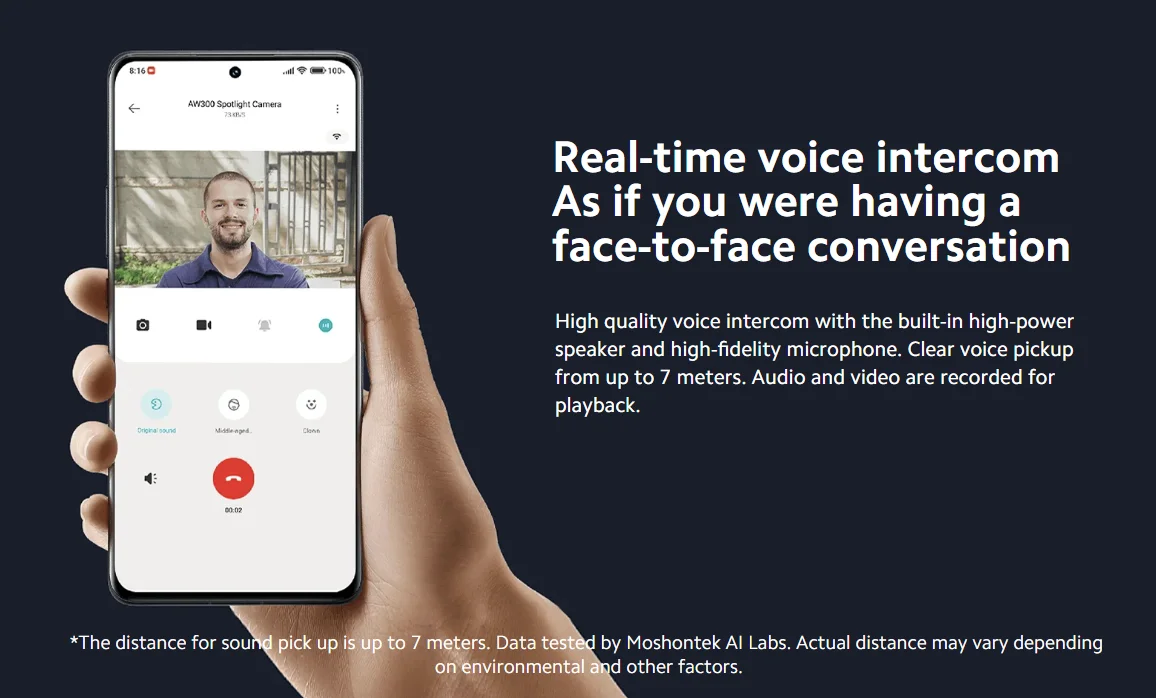 High quality voice intercom with the built-in high-power speaker and high-fidelity microphone. Clear voice pickup from up to 7 meters. Audio and video are recorded for playback.