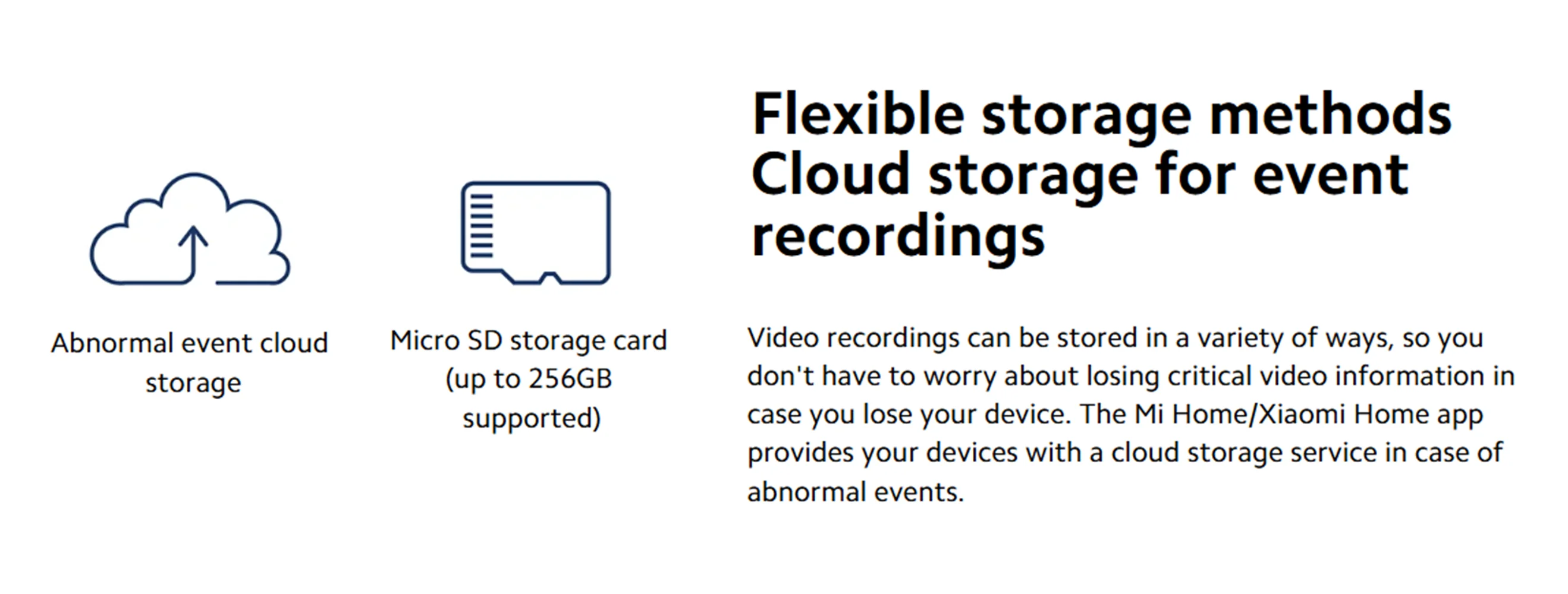Video recordings can be stored in a variety of ways, so you don't have to worry about losing critical video information in case you lose your device. The Mi Home/Xiaomi Home app provides your devices with a cloud storage service in case of abnormal events.