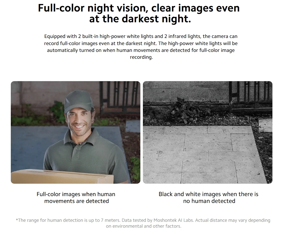 Equipped with 2 built-in high-power white lights and 2 infrared lights, the camera can record full-color images even at the darkest night. The high-power white lights will be automatically turned on when human movements are detected for full-color image recording.