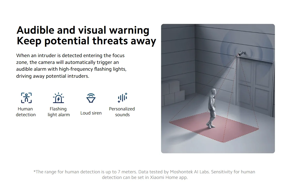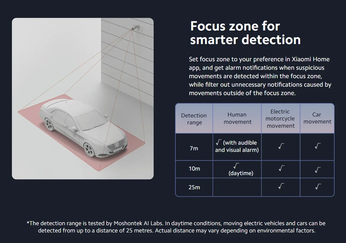 Set focus zone to your preference in Xiaomi Home app, and get alarm notifications when suspicious movements are detected within the focus zone, while filter out unnecessary notifications caused by movements outside of the focus zone.