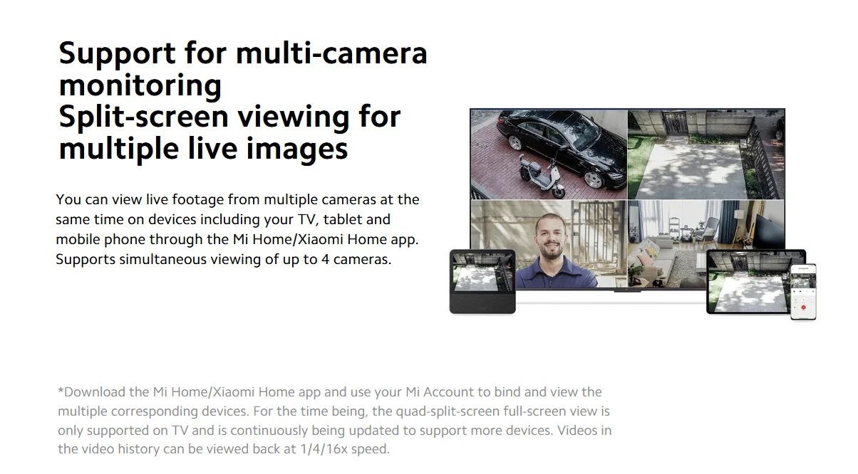 You can view live footage from multiple cameras at the same time on devices including your TV, tablet and mobile phone through the Mi Home/Xiaomi Home app. Supports simultaneous viewing of up to 4 cameras.