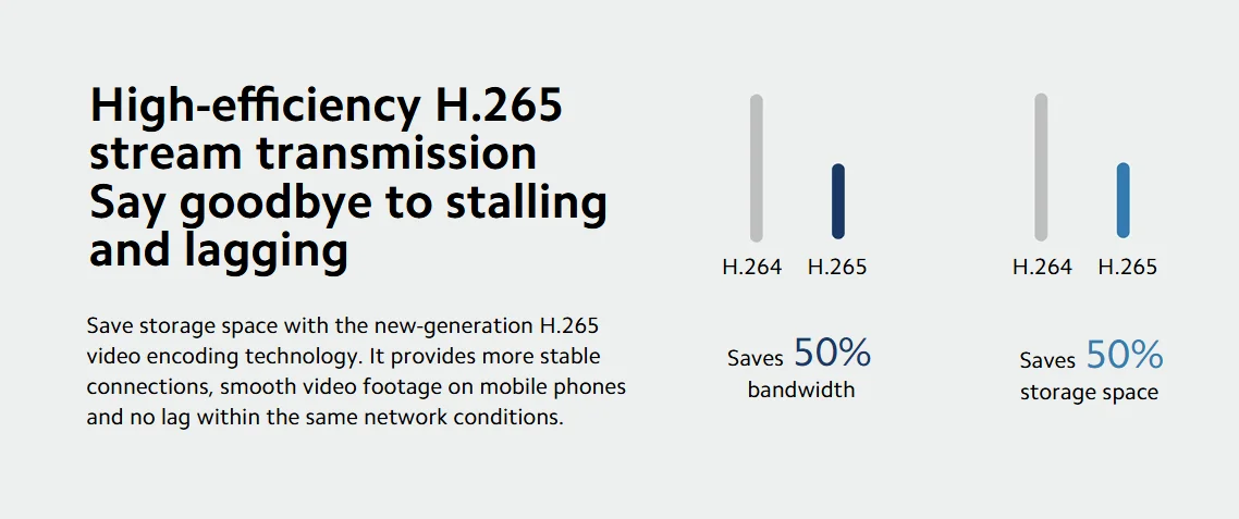 Save storage space with the new-generation H.265 video encoding technology. It provides more stable connections, smooth video footage on mobile phones and no lag within the same network conditions.